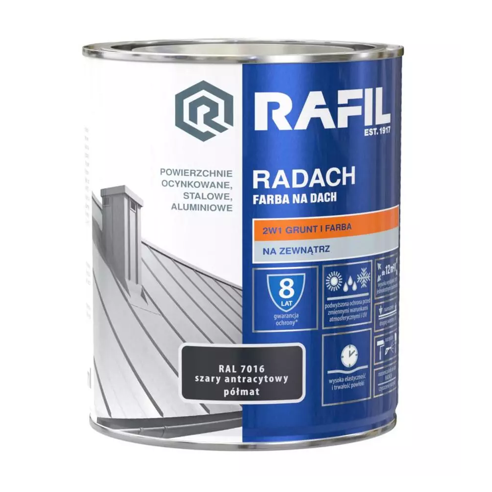Farba na dach Radach Antracyt 0.75l to profesjonalna farba do malowania dachów, rynien i parapetów. Produkt 2 w 1: grunt + farba. Zapewnia podwyższoną ochronę przed działaniem zmiennych warunków atmosferycznych i promieniowaniem UV. Została wyprodukowana na bazie akrylu i poliwinylu. Farba na dach Radach szary antracyt RAL7016 zapewnia półmatowy efekt.
