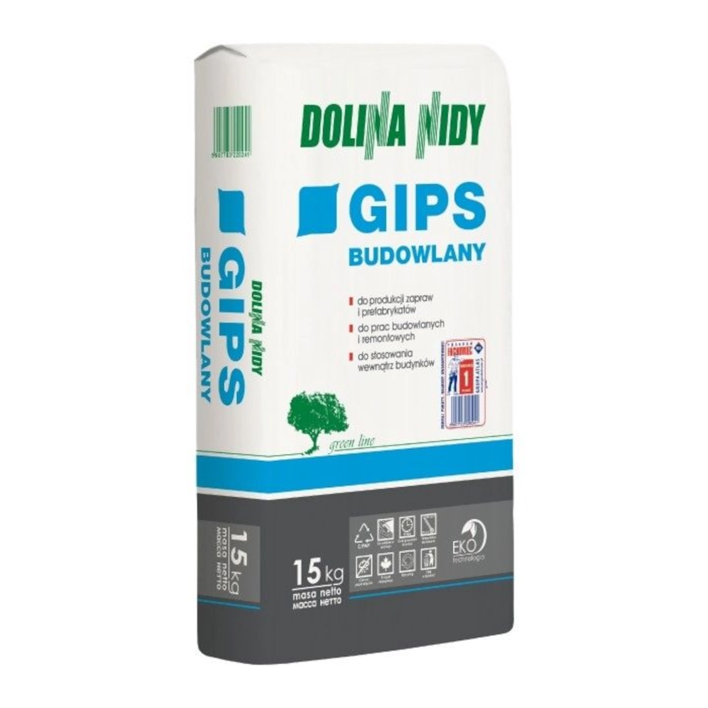 Gips budowlany Dolina Nidy 15kg to materiał budowlany, który jest powszechnie stosowany do wykańczania powierzchni ścian i sufitów. Opakowanie waży 15 kg, co jest popularnym rozmiarem dla zastosowań domowych i warsztatowych.