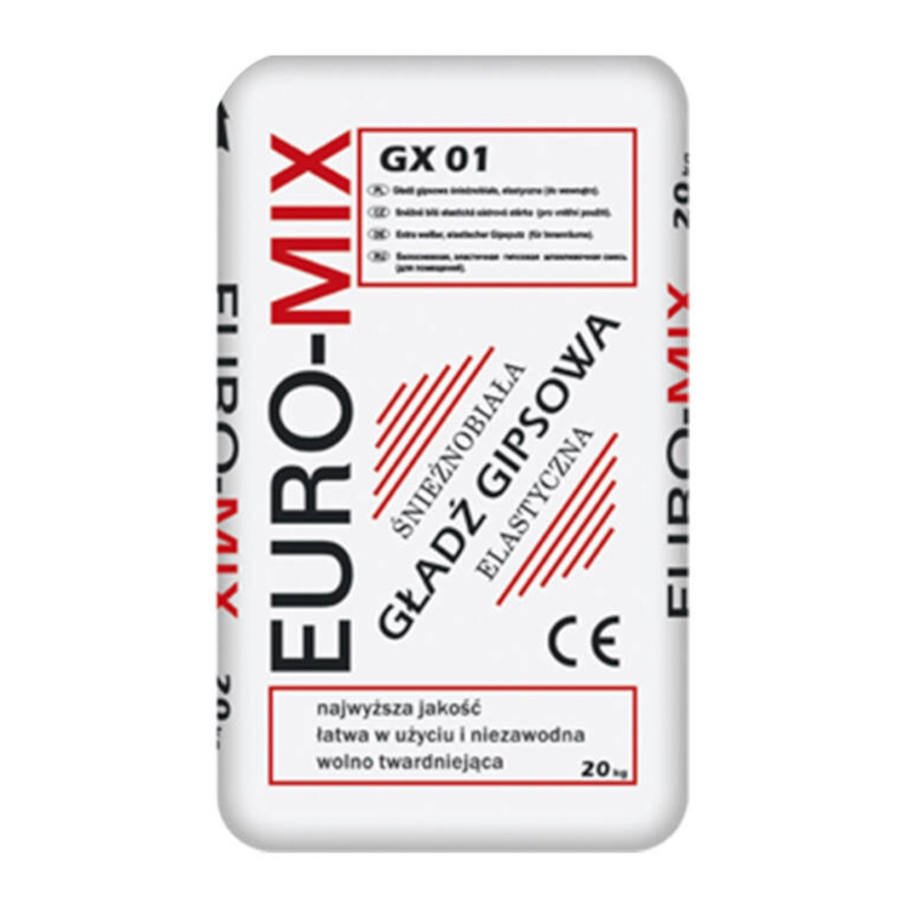 Gładź Gipsowa Euromix GX-1 20kg to gotowy do użycia produkt w kolorze śnieżnobiałym, służy do wygładzania powierzchni ścian i sufitów przed malowaniem lub tapetowaniem. Jest to mieszanka gipsu i specjalnych dodatków, która po zmieszaniu z wodą tworzy gładką, lekką i łatwą do aplikacji masę.